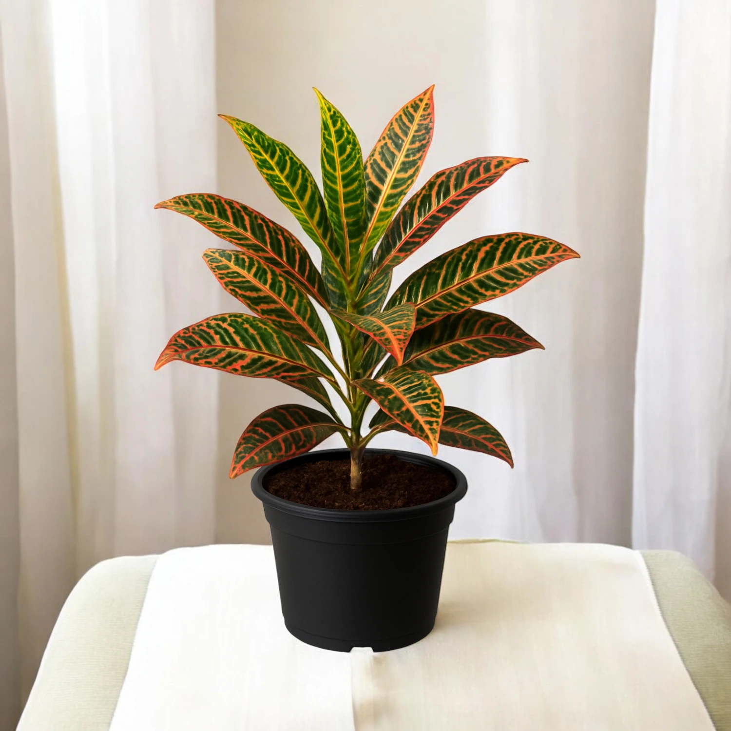 CHIRONJI CROTON IS A COLORFUL ORNAMENTAL PLANT KNOWN FOR ITS NARROW, ELONGATED LEAVES WITH A MIX OF GREEN, YELLOW, AND SOMETIMES RED OR ORANGE STREAKS. IT IS ONE OF THE MANY BEAUTIFUL CULTIVARS OF THE CROTON PLANT FAMILY, POPULAR FOR INDOOR AND OUTDOOR DECORATION.